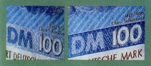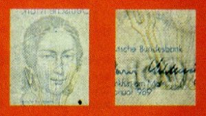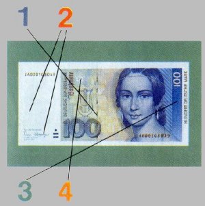 Safety features: The technical development has reached our money. It has become safer against reproduction with the help of modern technology. The German Bank has developed a series of banknotes with improved safety features. It's easy to determine if a bill is genuine with the following safety features: |
